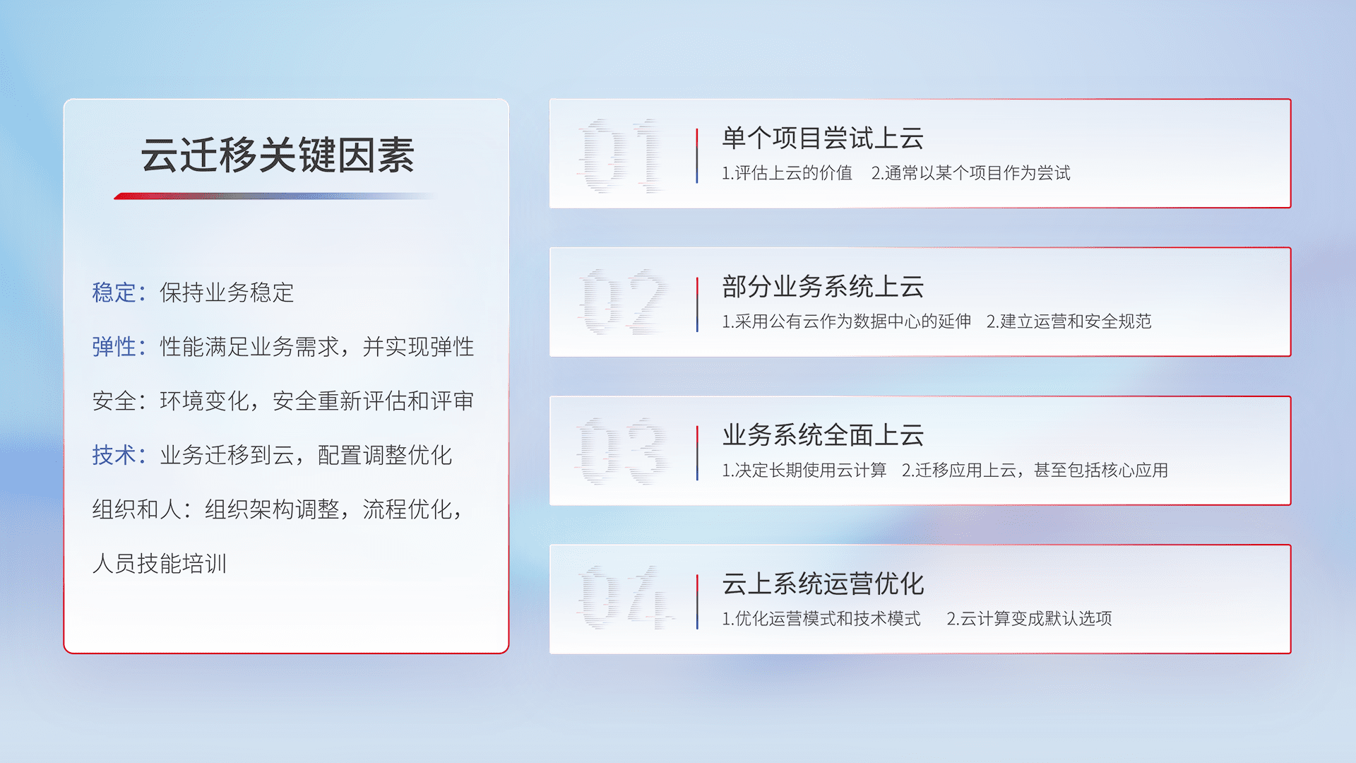 结合实际业务,,从规划设计、、、云平台选型、、云原生改造、、数据迁移、、、、集成交付,,迁移全过程为客户识别最佳上云路径,,,,做好风险识别管理,,,设计网络架构、、身份权限、、、、安全审计合规、、操作审计、、、、日志审计、、、监控告警策略、、多站点容灾设计等,,,,对云上基础设施进行整体规划,,,,提升IT治理水平,,,,以满足弹性、、、、高可用、、高性能的需求。。。